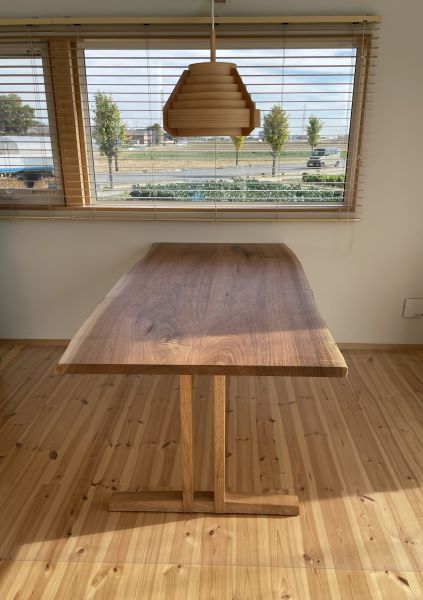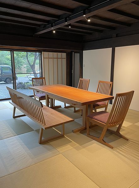 ケヤキ一枚板のテーブルと背もたれのあるベンチ